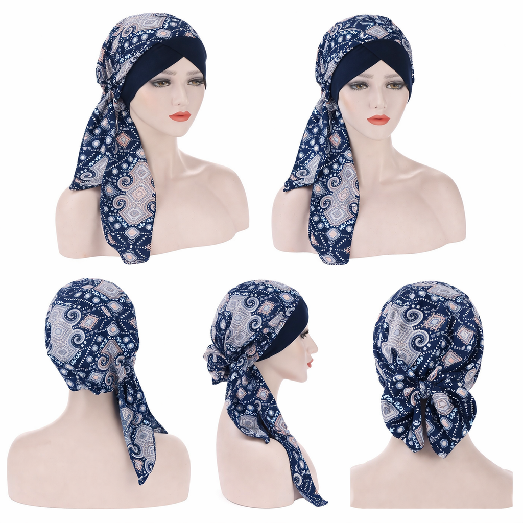 Our Navy Bandana Cap is an easy, ready-to-wear style designed for comfort, coverage and everyday convenience. Featuring a deep navy print with a flattering crossover front and tie detail, it gives the look of a styled headscarf with minimal effort.